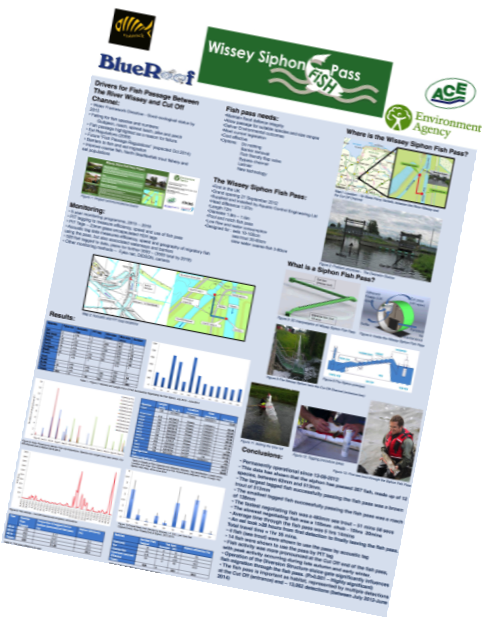 The monitoring project ran for 4 years. During this time >250 fish have successfully passed through the Syphon. A total of 12 different species ranging from 62-513mm passed through the Syphon to gain access to the upper Wissey above the sluice and out of the cut Off channel. The largest fish to pass was a brown trout and the fastest passage was made by a sea trout (51mins 58 secs).The average passage time was 5 hrs 14 mins. the syphon creates important refuge habitat for fish at the end of the Cut Off channel as evidenced by the number of detections of tagged fish at this end of the Syphon (>13000 detections between July 2012 & June 2014). peak activity around the Syphon and through the pass was during autumn and early winter. Some of the data has been analysed and presented at conference (IFM Tagging Conference, Leeds, 2014) and the remainder is programmed in for full analysis and reporting in the near future.